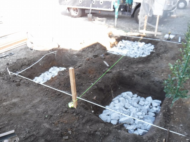 ぐり石の、隙間に砕石が入っていくので、地盤が固くなります。