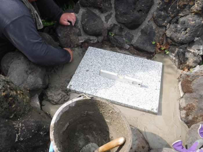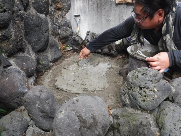 少し水分多めの、モルタルを敷いて土台の石を取り付けます。